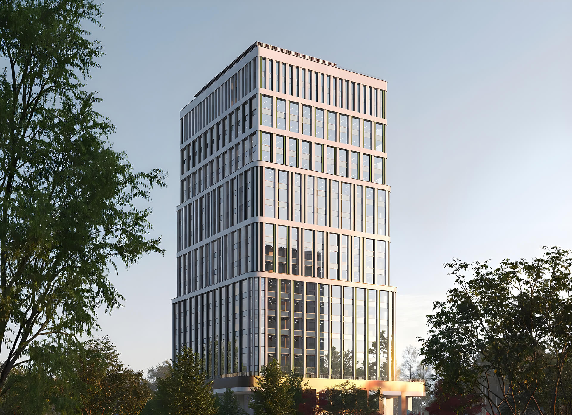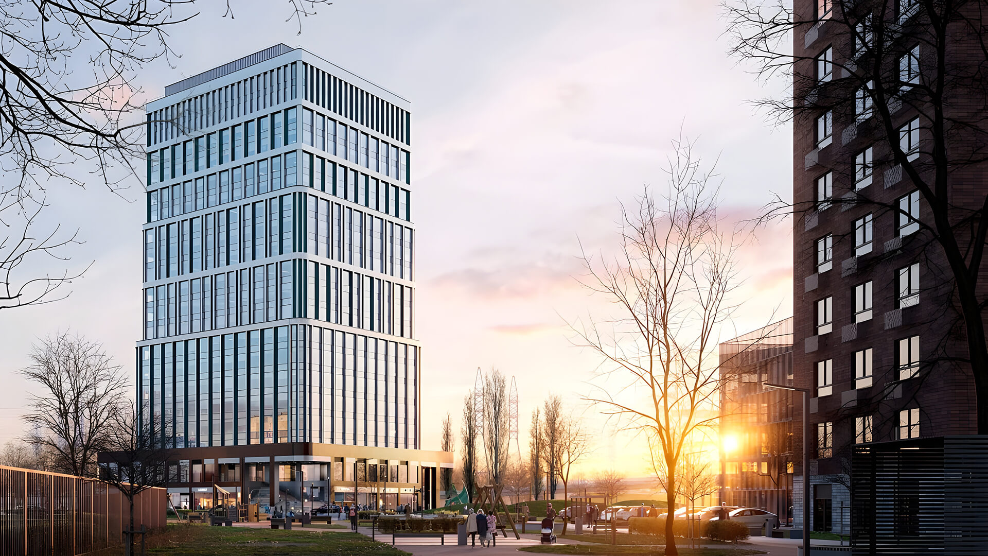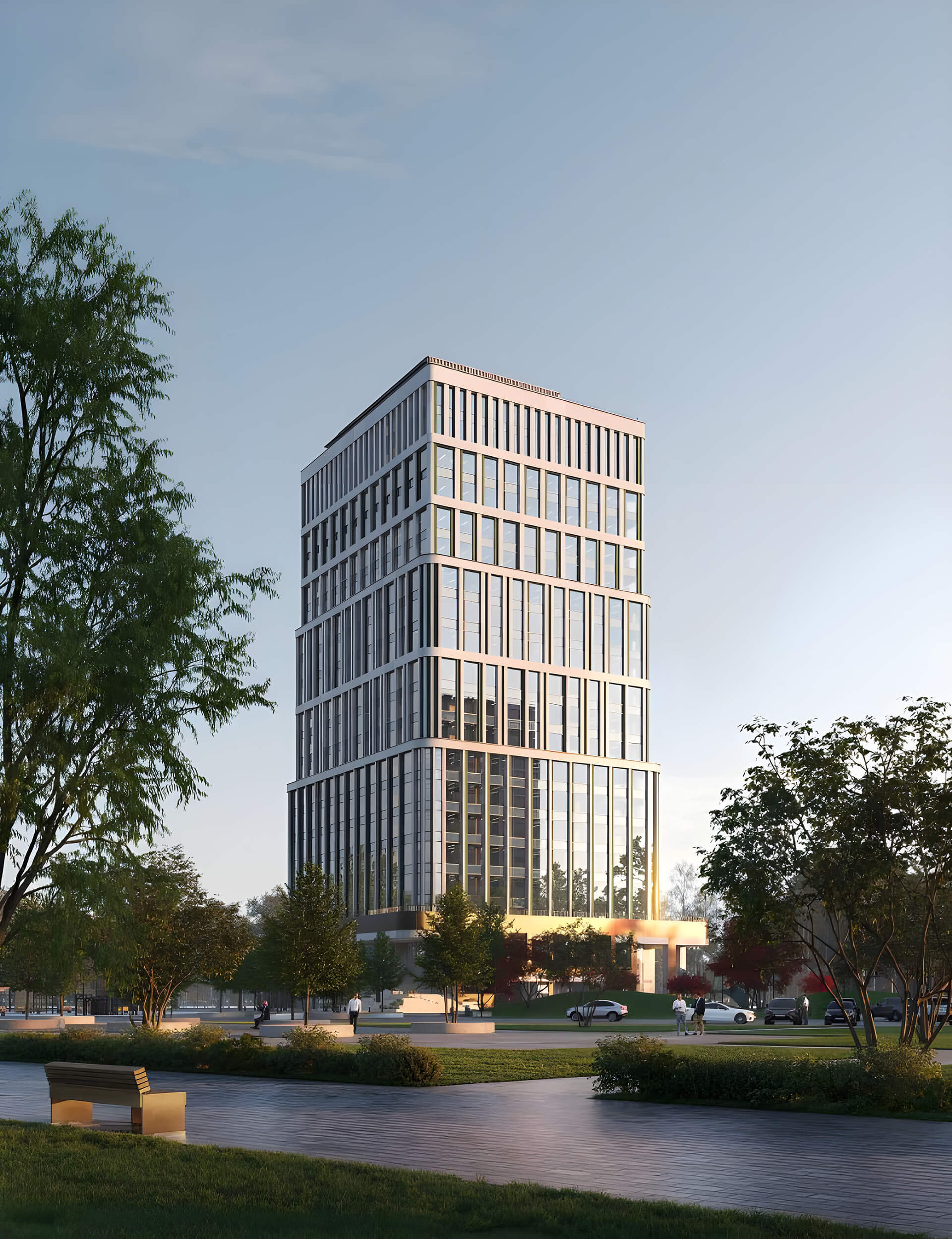 Центром благоустроенной территории станет амфитеатр, который будет использоваться для деловых и культурных мероприятий. Такое решение превращает пространство вокруг здания в точку притяжения, усиливая его ценность как для резидентов, так и для жителей района.