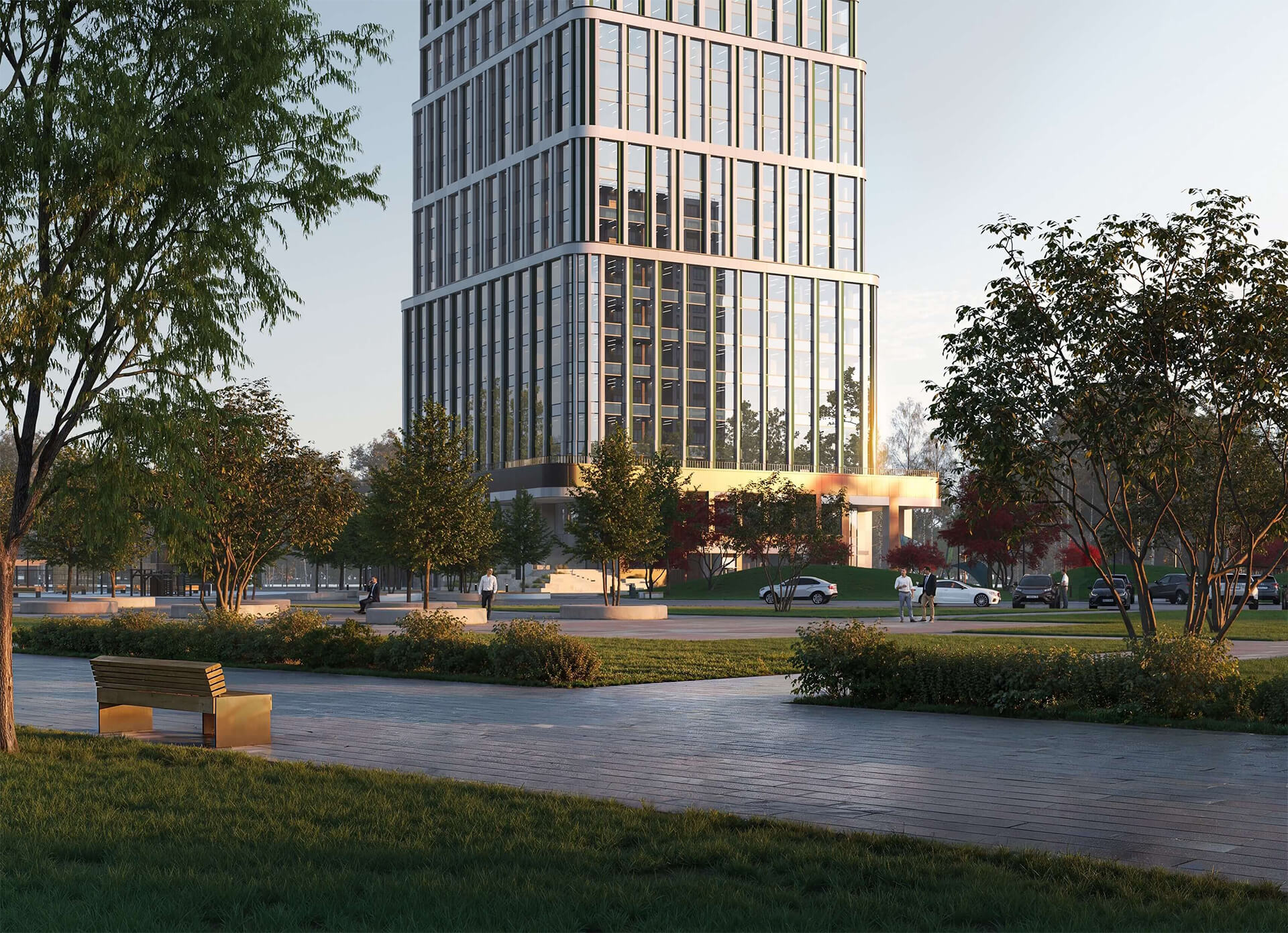 Центром благоустроенной территории станет амфитеатр, который будет использоваться для деловых и культурных мероприятий. Такое решение превращает пространство вокруг здания в точку притяжения, усиливая его ценность как для резидентов, так и для жителей района.